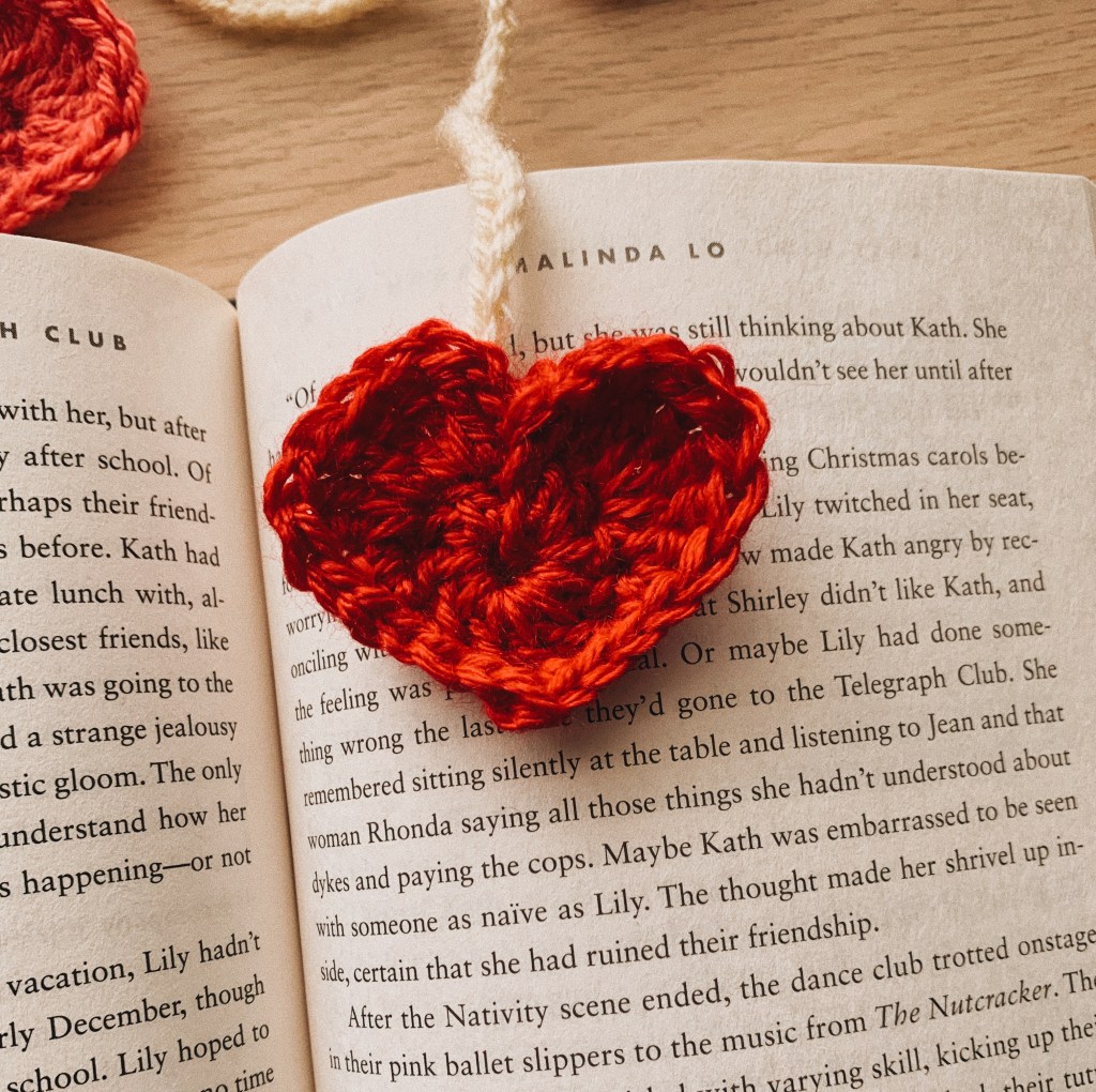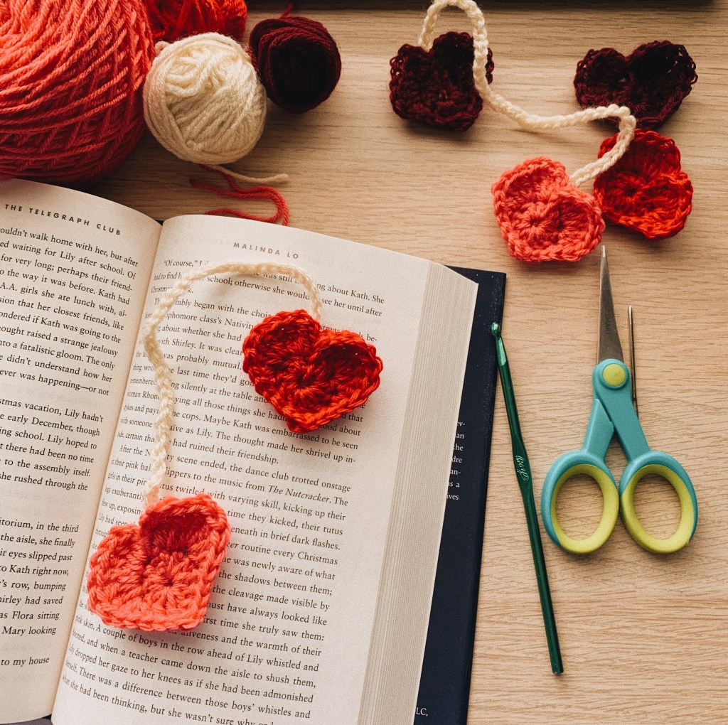 I first started out with the plan to make a garland to go around my bookshelf, but I realized I didn’t have enough yarn to make several hearts in various colors. So instead, I decided to make them into little bookmarks. How else can you celebrate the love for your current read? For connecting the hearts, I just did a simple crocheted chain for about 50 stitches and then sewed the pieces together. I will admit, the backs of these little hearts aren’t the prettiest.